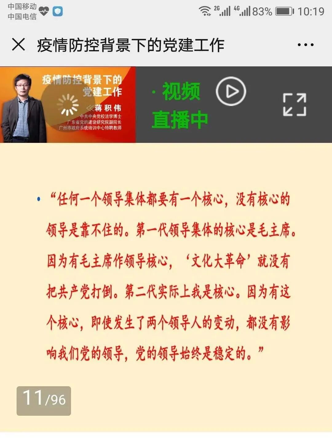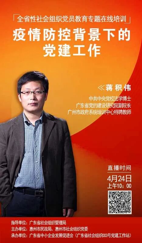 本次线上培训由广东省党的建设研究院副院长、法学博士蒋积伟教授主讲。主要从疫情防控看我国的制度特点和优势、透视疫情防控中党建工作的成效和不足、党建工作的新趋势和新要求三方面进行培训,结合当前社会组织参与疫情防控及助力企业复工复产的阶段性工作需求,探索和积累在新时代、新形势下我省社会组织基层党建工作的路径和经验。