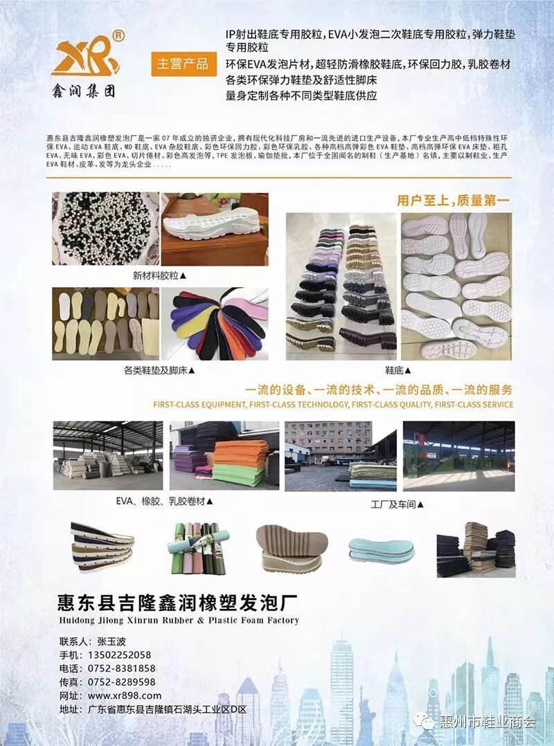 惠东县吉隆鑫润橡塑发泡厂是一家07年成立以生产EVA鞋材为龙头的独资企业,拥有现代化科技厂房和一流先进的进口生产设备(1000-1350吨的进口发泡油压机多台,全自动先进流水加工线多条),专业生产高中低档特殊性环保EVA、瑜伽垫、运动EVA鞋底、MD鞋底、EVA杂胶鞋底、彩色环保回力胶、彩色环保乳胶、各种高档高弹彩色EVA鞋垫、高档高弹环保EVA床垫、粗孔EVA、无异味EVA、彩色EVA、切片倦材、彩色高发泡、TPE发泡板等,产品畅销国内、欧美、东南亚,同很多外贸和内销鞋服公司建立了良好、稳定的合作关系。工厂位于闻名的中国女鞋生产基地·惠东县吉隆镇324国道旁,沈海高速(白云仔)高速路出入口斜对面石湖头工业区D区,环境优越,工厂占地面积20000平方,拥有厂房6000平方,一批专业的高科技技术人员和员工200多名。